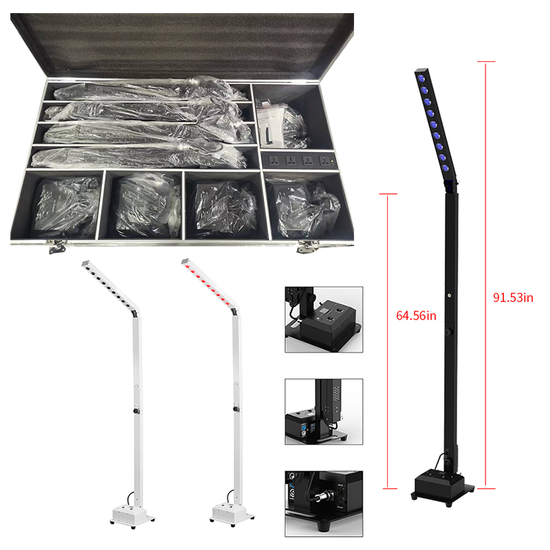 Voltage:100-240V 50-60Hz Power Draw:90W LEDs : 9pcs 10W RGBWA+UV 6-IN-1 LED Beam Angle:15° DMX Channels: 2 DMX modes, 6channels mode & 10 channels mode Control mode:DMX, Wireless, WIFI, Remote, Master-slave, Auto Dimmer: 0-100% with regulated constant color control Battery: Battery type: Lithium Ion Battery Charge Time: 6hours(full power) Battery Life: (all on) 4hours, (single Color) 24hours Battery Power: 11.1V, 25Ah Wireless effective distance: 400meters Strobe rate:0-24HZ Cover: Aluminum Net weight:13.5KG Product high:2-2.5M